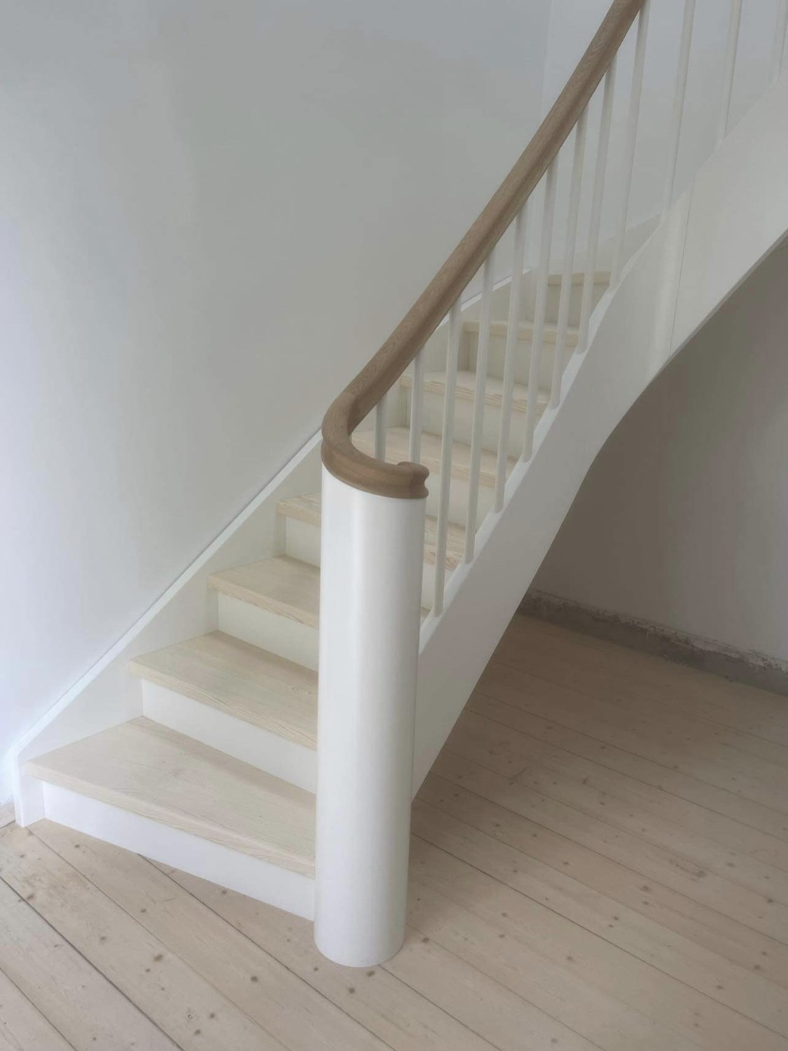 Vi designer flere forskellige typer kvartsvingstrapper. Den mest almindelige type består af en start stolpe, midterstolpe og en stolpe ved udtrinnet. Ønsker man en mere ekslusiv trappe kan trappen laves med et hovedstykke og en håndlistekrumning. Kvartsvingstrappen kan også laves med repos.